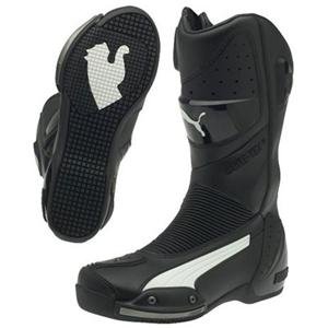 | Puma Desmo GTX Boots - 41 Euro/Black/White #Puma Desmo GTX Boots The Desmo GTX is a performance boot that focuses on versatility, specifically designed for sports riders. Features The Desmo GTX is lined with high quality Gore-Tex material An unparalleled protectioncomfort combination The Desmo GTX offers advanced impact protection due to a vast array of features, such as the internal nylon ankle bone protection, its TPU shin plate, the molded TPU heal counter, the forefootand heal zinc sliders, and its additional TPU sliders for maximum protection on the shaft Its comfort level far exceeds what protective sports boots typically offer, with flexible inserts at the heal and forefoot for an easy in-step feel, a rubber gear shifter and pre-molded sockliner to absorb vibration, a water resistant zipper system, and breathable fabric lining In addition to superior protection, the upgraded Desmo GTX boot also has a high-density rubber outsole that provides extra stability, grip and abrasion resistance on the outsole, so you feel at ease when youre hitting high speed maneuvers
